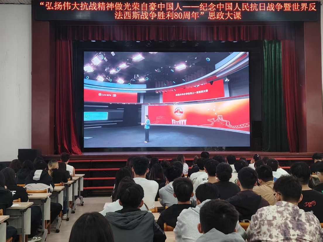 为纪念中国人民抗日战争暨世界反法西斯战争胜80周年,深切缅怀革命先烈,弘扬伟大抗战精神,激发广大学生的爱国热情与民族自豪感,2025年9月18日,我院团委积极响应教育部、中央网信办、人民日报社、国家文物局的联合号召,联合我院思政部,组织150余名院系团干部在学院大礼堂,集中观看了“弘扬伟大抗战精神 做光荣自豪中国人——纪念中国人民抗日战争暨世界反法西斯战争胜利 80 周年”思政大课”之“大学篇:大国担当”。