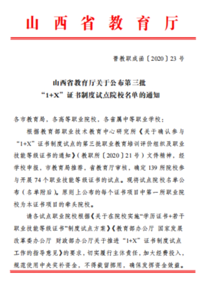 2020-2022年认定为界面设计职业技能等级证书、产品创意设计职业技能等级证书、室内设计职业技能等级证书、数字影像处理职业技能等级证书四项山西省1+X证书制度试点院校。